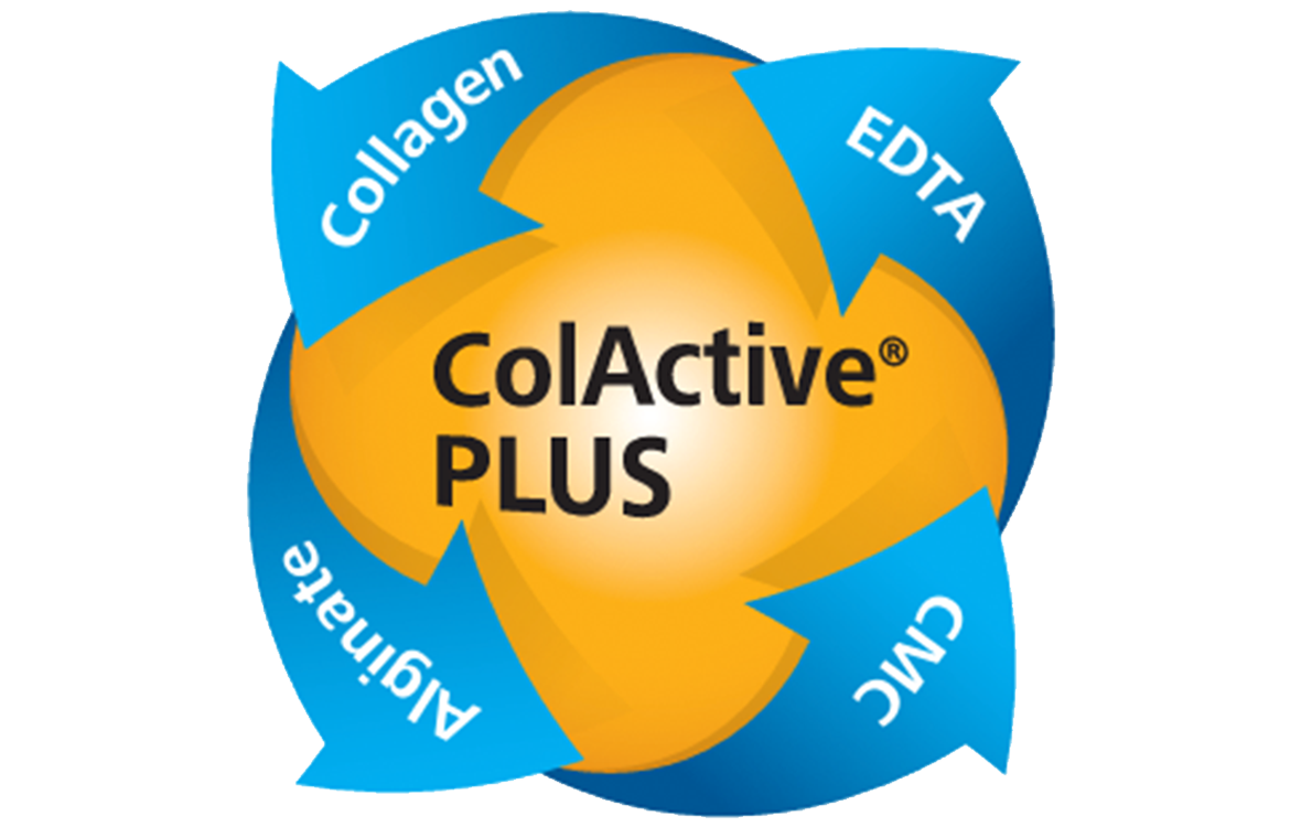ColActive® PLUS collagen dressings are made from a patented blend of Collagen, EDTA (ethylenediaminetetracetic acid), Alginate and CMC (carboxymethylcellulose).