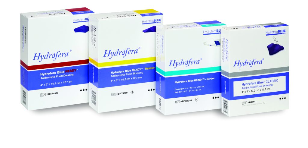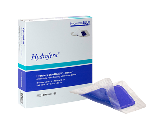 Hydrofera Blue READY-Border® are antibacterial foam dressings that maintain a moist wound environment without the need for hydration. These sterile dressings provides secure wound protection and atraumatic dressing removal because of its silicone adhesive borders.