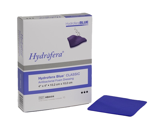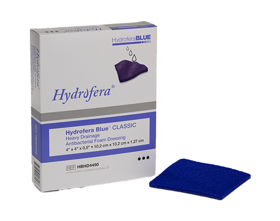 Hydrofera Blue CLASSIC® antibacterial foam dressings continuously wick bacteria laden exudate into the foam and away from the wound surface. Constructed of open-celled polyvinyl alcohol (PVA) foam, this dressing effectively manages exudate while creating a moist wound healing environment.