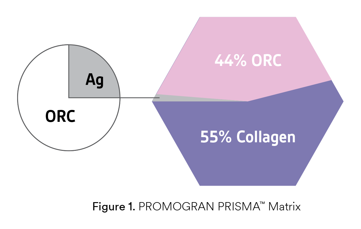 is a sterile, freeze-dried composite that consists of 44% ORC, 55% bovine collagen, and 1% Silver/ORC of which 1/4 of the total weight of the Silver/ORC is silver (Figure 1). Thus, PROMOGRAN PRISMATM Matrix contains 0.25% w/w total silver.