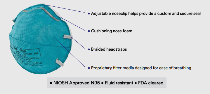 As a disposable particulate respirator, it is intended to help reduce wearer exposure to certain airborne particles, including those generated by electrocautery, laser surgery, and other powered medical instruments. As a surgical mask, it is designed to be fluid-resistant to splash and spatter of blood and other infectious materials. It meets CDC guidelines for Mycobacterium tuberculosis exposure control.