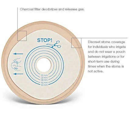 The ActiveLife stoma cap with filter is an opaque skin barrier with a no-tape collar. These caps can be enlarged to fit stomas 3/4 – 2 Inches.