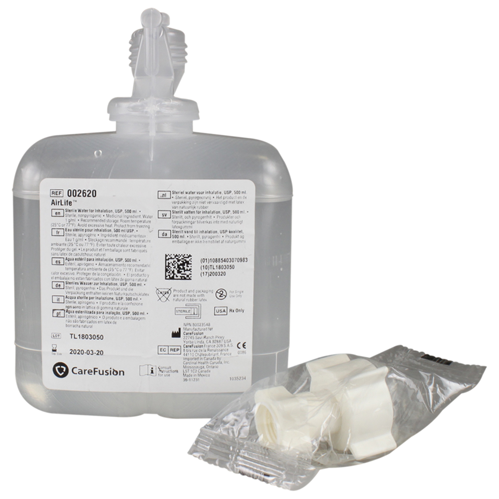 AirLife Humidifier Kit 500mL w Humidifier Adapter: Filled with sterile water for inhalation, these humidifier systems feature a snap-open trigger, which makes a round opening for secure attachment of the humidifier adapter. Ssytem has a 4psi pressure-relief valve with alarm.