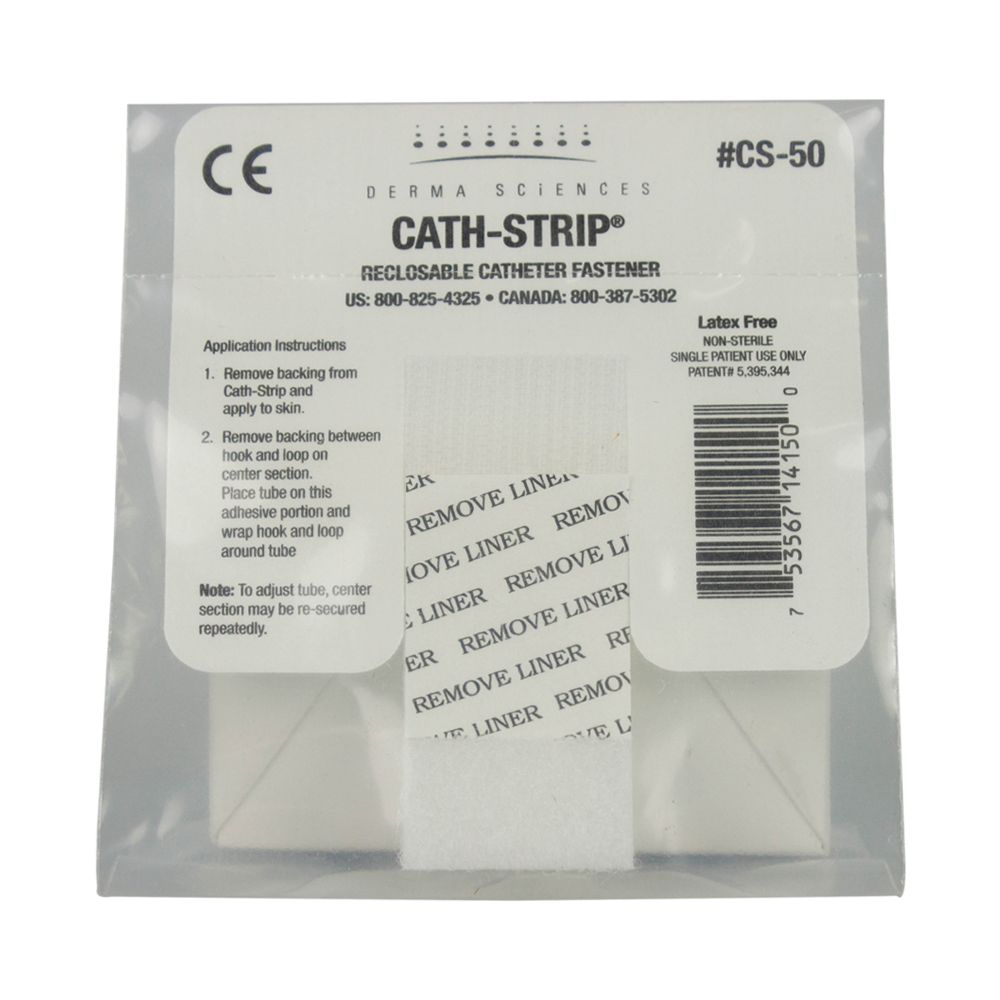 Cath-Strip Reclosable Catheter Fastener is a multi-use, reclosable catheter fastener. The exclusive material features flexibility and dynamic adherence which provide excellent tape-to-skin adhesion while minimizing the tension that may result in irritation, blistering, or skin shear Cath-Strip is designed to accommodate a variety of catheter fastening requirements including urinary catheters gastrostomy and jejunostomy tubes, wound drainage systems, central line catheters, and multi-port IVs. Does not contain natural rubber latex.