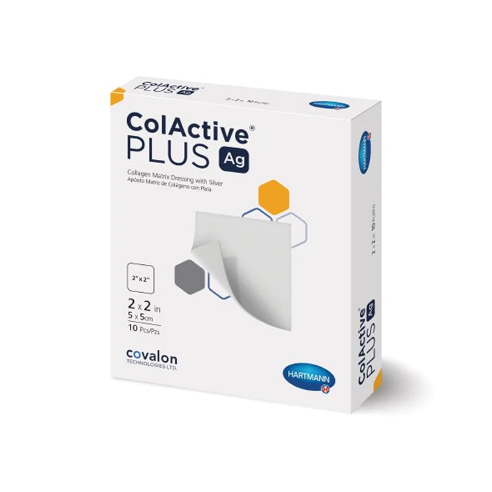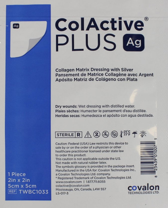 An advanced wound care dressing, ColActive® Plus Ag is formulated with a patented blend collagen, sodium alginate, carboxymethyl cellulose (CMC), ethylenediaminetetraacetic acid (EDTA) and silver chloride. Once it comes in contact with the wound fluid, this topically applied dressing transforms into a soft gel sheet that helps create a moist environment for healing, including the formation of granulation tissue and epithelialization.