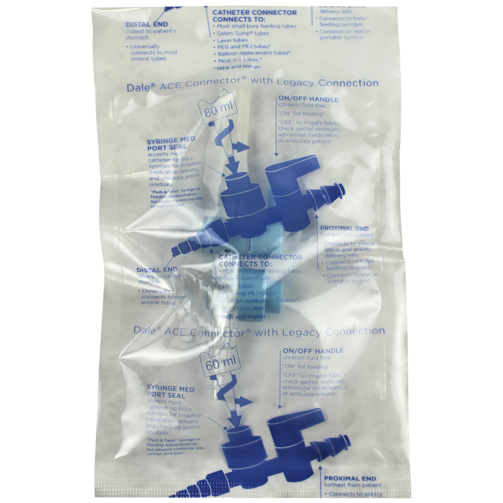 The Dale ACE* Connector *(Access Controller for Enteral-Legacy Type) minimizes the risk of messy leaks, and protects the clinician from potentially infectious gastric splash-back, while shielding the patients from external contamination. The Dale ACE Connector controls fluid flow into and out of most NG type feeding tubes, Dobbhoff, Levin, Salem Sump, Suction Tubes, 18 French+ PEG, 18 French+ PEJ, and most 18 French+ G-J Gastrostomy tubes. The ACE Connector replaces 5-in-1 connectors and enteral feeding Y-port universal adapters.