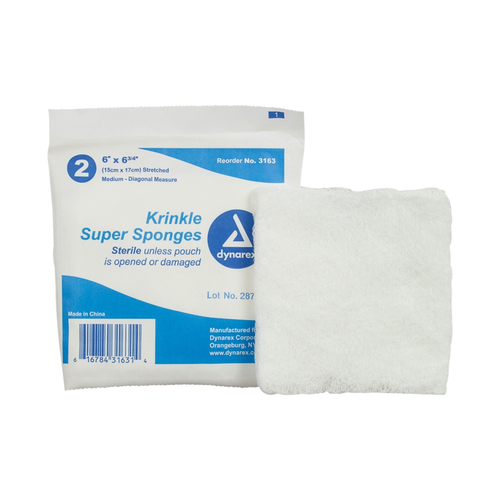 Sterile super sponges by Dynarex are a highly absorbent gauze sponge. Krinkle gauze sponges provide sterile cushioning support for the wound site. Sterile super sponges and most Dynarex medical supplies are sold by the box or case.