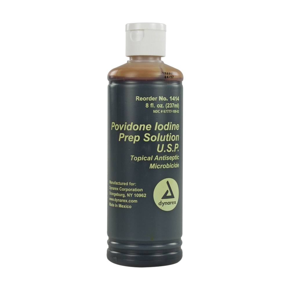 Dynarex Povidone Iodine Prep Solution consists of 10% povidone iodine, the USP equivalent of 1% available iodine. This solution helps prepare the skin before surgical procedures and serves as an antiseptic for cleaning skin abrasions, minor burns and lacerations.