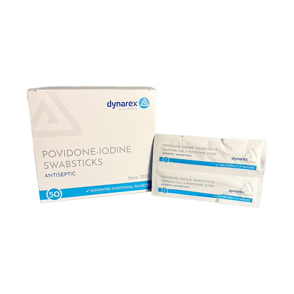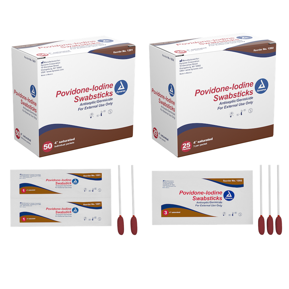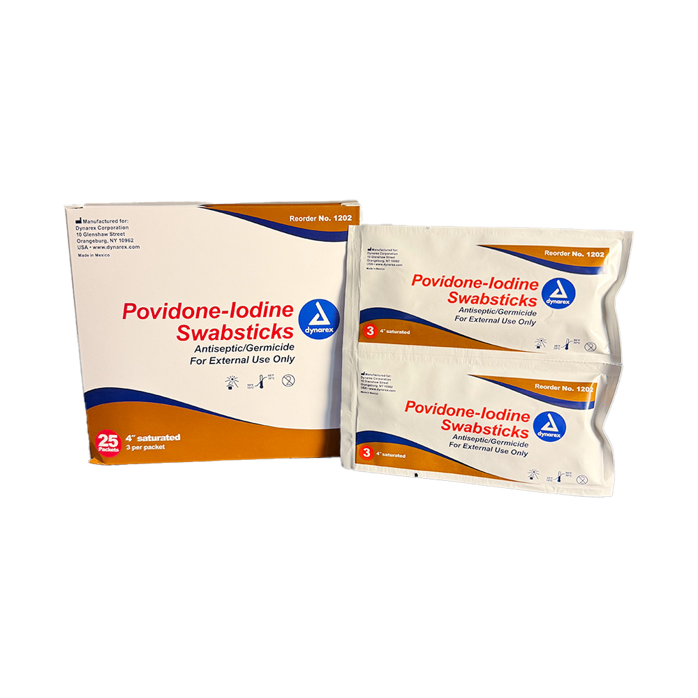 Dynarex Swabsticks have an applicator swab on both ends of shaft. The Povidone Iodine is ideal for venipuncture, IV starts, renal dialysis and pre-op prepping, prep for blood donors, dialysis, and skin antiseptic. The Swabsticks and scrubsticks contain 10 percent povidone iodine solution similar to Betadine.
