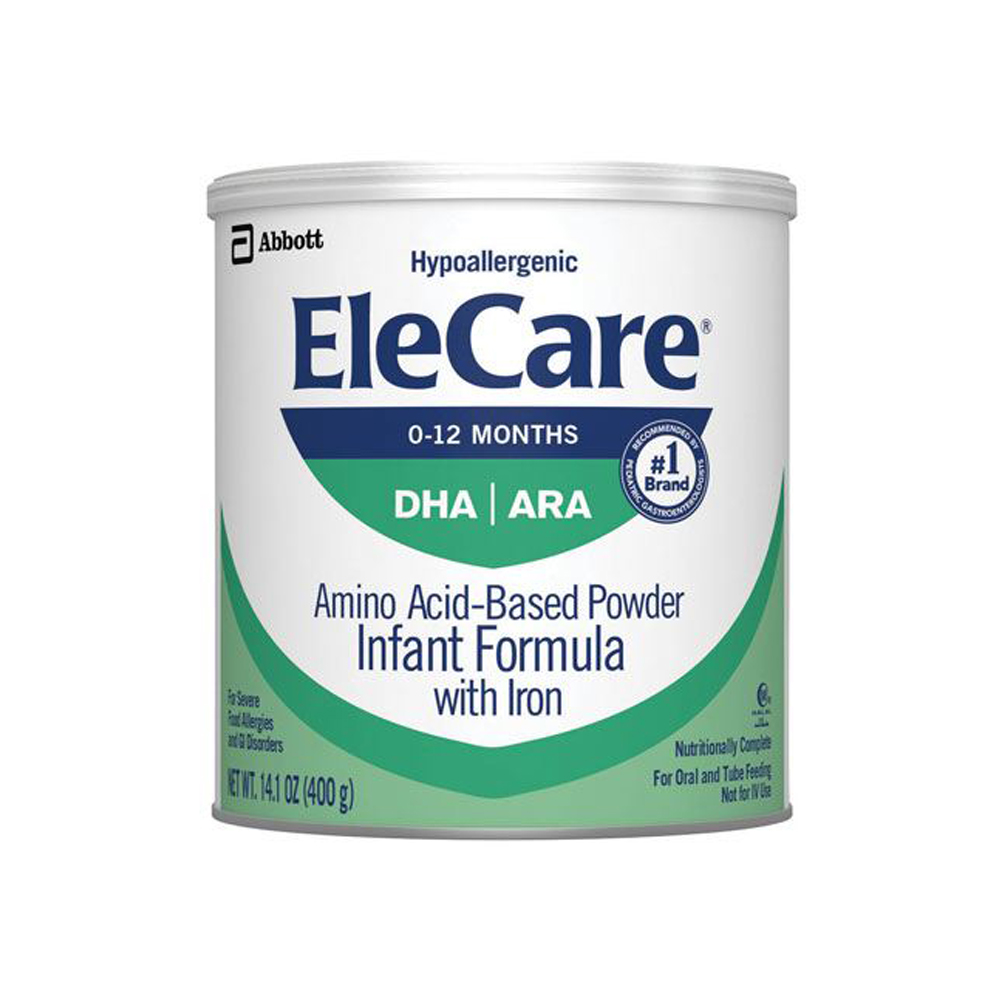 A 20 Cal/fl oz, nutritionally complete amino acid-based formula for infants who cannot tolerate intact or hydrolyzed protein. EleCare is indicated for the dietary management of protein maldigestion, malabsorption, severe food allergies, short-bowel syndrome, eosinophilic GI disorders, GI-tract impairment, or other conditions in which an amino acid-based diet is required. For infants 0-12 months of age. For oral or tube feeding. Use under medical supervision.