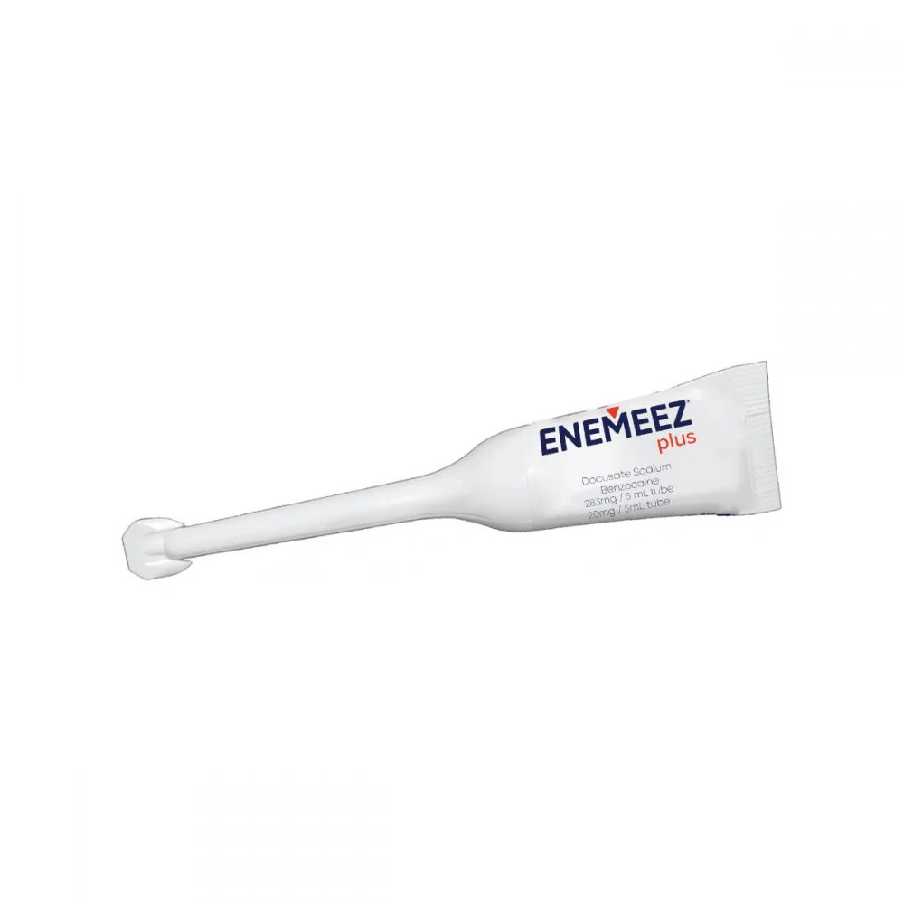 The active ingredient found in ENEMEEZ® Plus mini-enemas is docusate sodium and include pain relieving benzocaine. The ENEMEEZ® Plus formulation functions as a stool softening hyper-osmotic laxative by drawing water into the bowel from surrounding body tissues. The docusate sodium acts as a softener by preparing the stool to readily mix with watery fluids. The increased mass of stool promotes a bowel evacuation by stimulating nerve endings in the bowel lining and initiating peristalsis. Not only does it soften and loosen the stool, but it initiates a normal replicated stimulus.