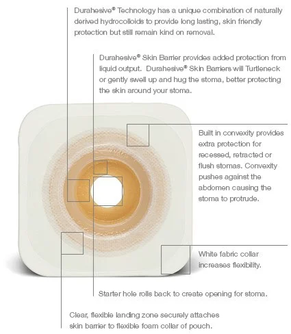 The Esteem synergy® ostomy system features an innovative Adhesive Coupling Technology™. Instead of plastic rings, a patented foam adhesive allows the pouch to be securely attached to the skin barrier on a clear plastic “Landing Zone” flange. The result is a low profile, flexible, two-piece system. Convex is good for people with a recessed or flat stoma. Moldable allows for improved skin protection over traditional barriers.