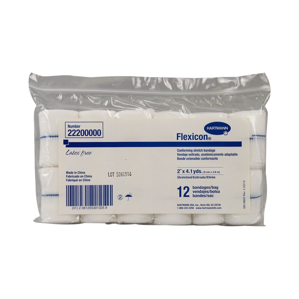 Flexicon Latex-free conforming stretch bandage with application guideline to ensure consistent wrapping and security. Flexicon is a durable conforming stretch bandage that holds dressings securely in place without slipping. A unique filament structure and nap ensures Flexicon will cling to itself. Uniform knitting of polyester yarns creates a strong bandage that stretches and conforms even to the most awkward and difficult-to-dress areas. Flexicon’s finished edges also minimize lint and unraveling.