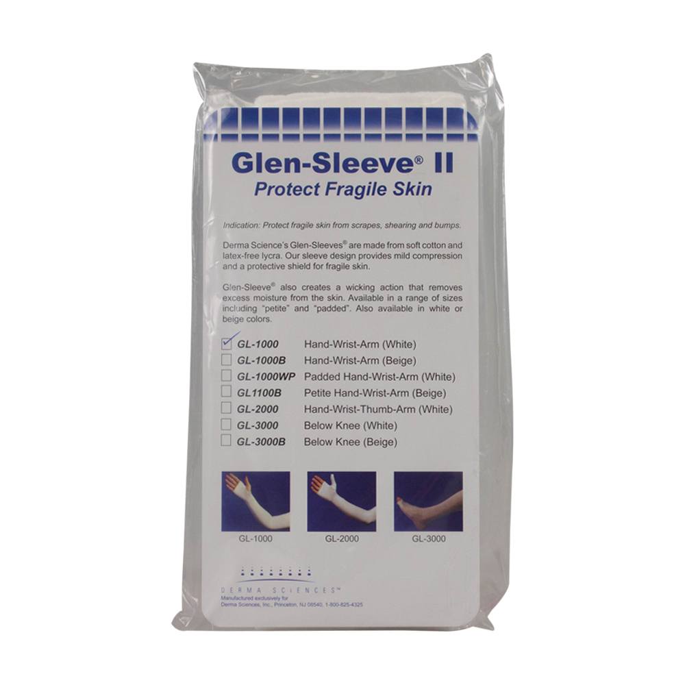 Glen-Sleeve II Arm and Leg Protectors. Knitted tubular sleeves designed to provide mild compression and protect the fragile skin of longterm care residents against everyday scrapes, shearing and bumps. Cotton and lycra construction with a polypropylene fiber that creates a wicking action to remove excess moisture from the skin. Durable sewn lockstitch construction with finished hems on both ends. Unique shaped heel (in leg protector). Does not contain natural rubber latex.