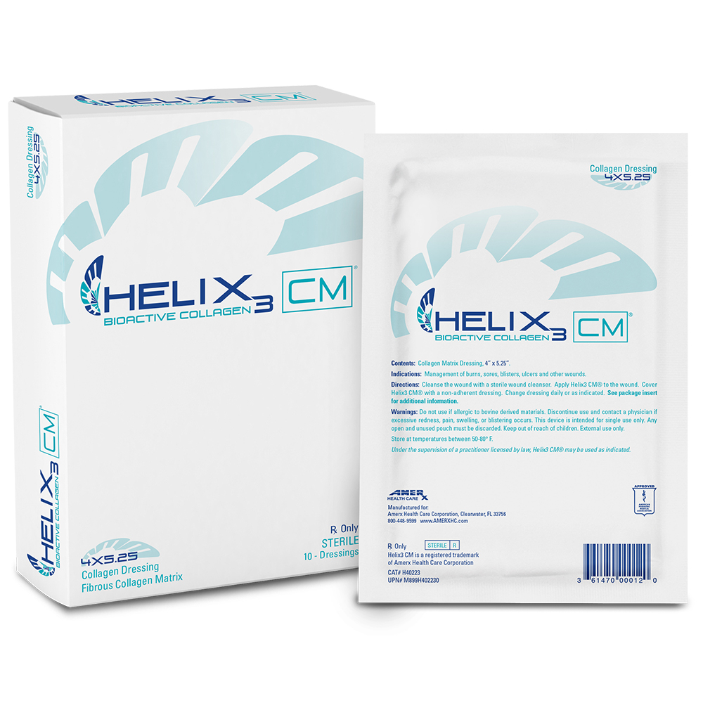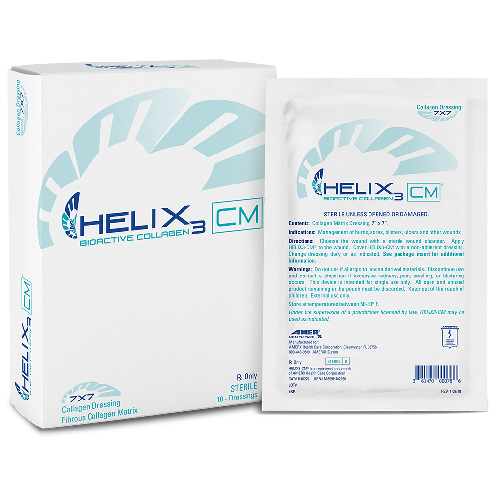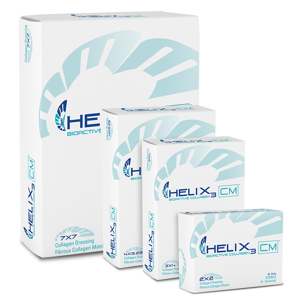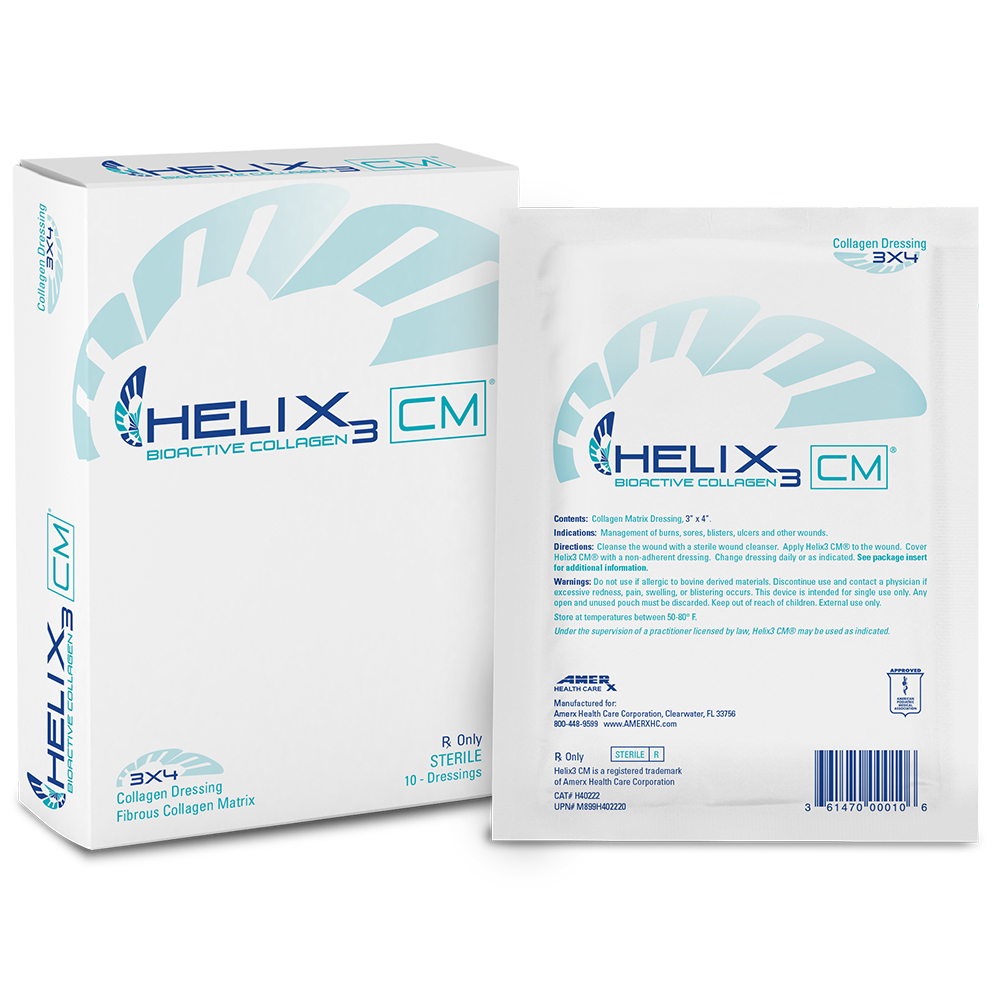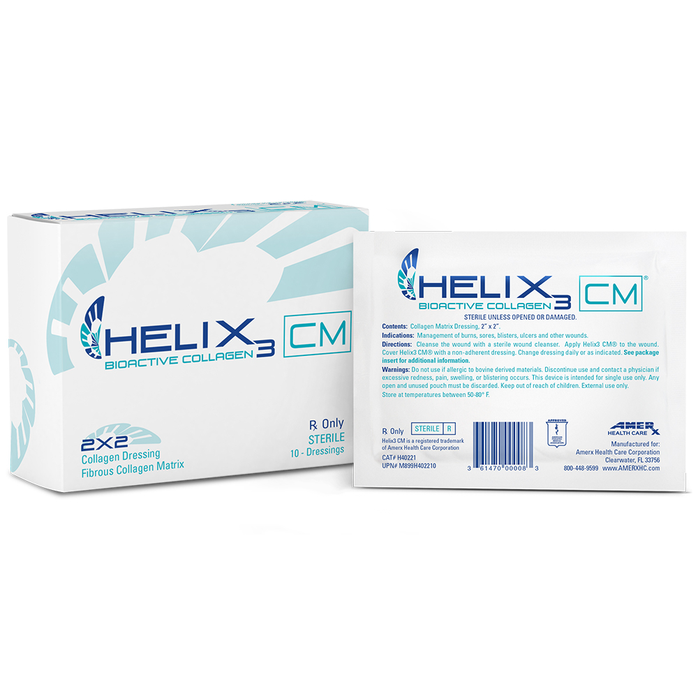 Maintain an optimal wound environment to promote moist healing of draining wounds with HELIX3-CM Collagen Matrix. The 100% Type 1 bovine native collagen increases bioavailability to deliver the benefits of collagen to the wound immediately. The highly absorptive, porous collagen sheets consist of a fibrous, triple-helix collagen structure which can be used in combination with topical agents. HELIX3-CM is non-adherent; contains no additives, synthetics, or fillers; and is effective in all wound phases.