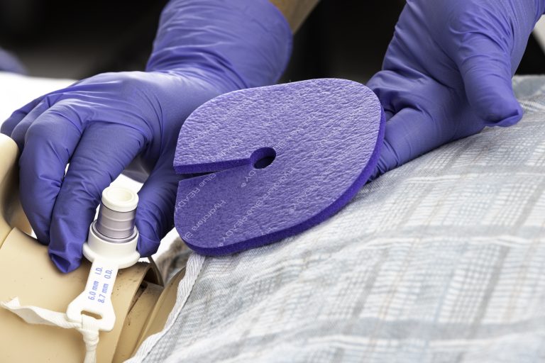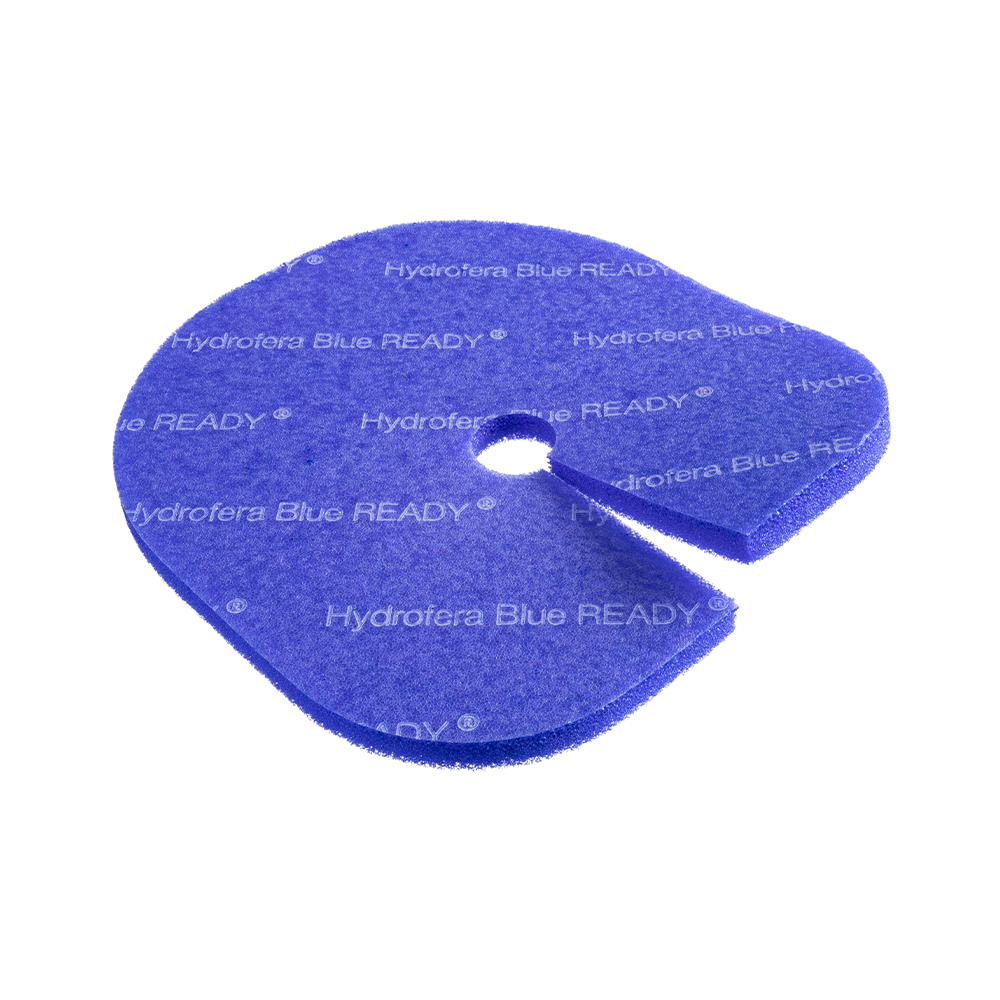 Experience the trusted reliability of Hydrofera Blue® with the latest addition to the family: Hydrofera Blue READY® Tube Site Dressing. This polyurethane (PU) foam dressing, with its intuitive shape and key-hole opening, allows for precise placement and ease of application around tracheostomy tubes and other tube sites. It absorbs and retains exudate within the dressing and offers a broad spectrum of antibacterial protection.