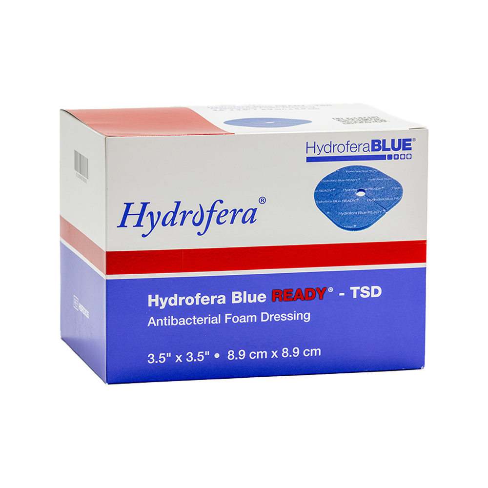 Hydrofera Blue READY® Tube Site Dressings are antibacterial foam dressings that maintain a moist wound healing environment without the need for hydration. Featuring a waterproof and breathable cover film and a pre-cut key-hole opening, the Tube Site Dressings are individually wrapped and ready to be used. These dressings are sterile, safe, and non-cytotoxic.