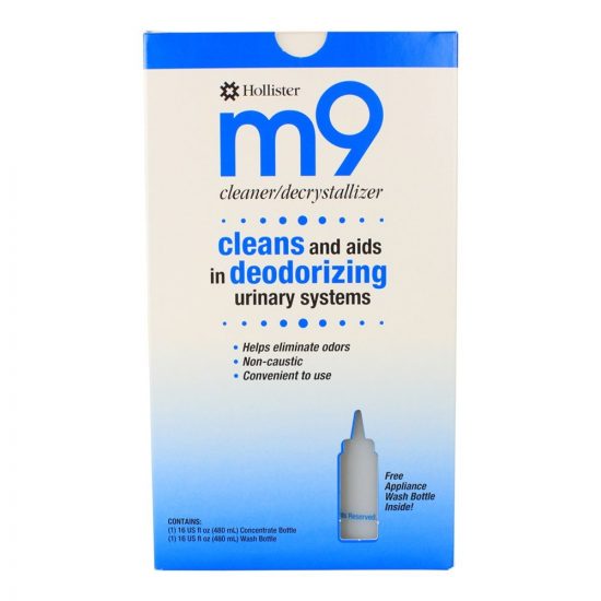 The Hollister m9 cleaner/decrystallizer is specially formulated for use with urinary drainage systems, such as urinary catheters and tubing. With a balanced pH content and a zero-acid content, this cleaner completely dissolves urinary crystals, leaving appliances clean and ready for use. m9 cleans and aids in deodorizing urinary systems.