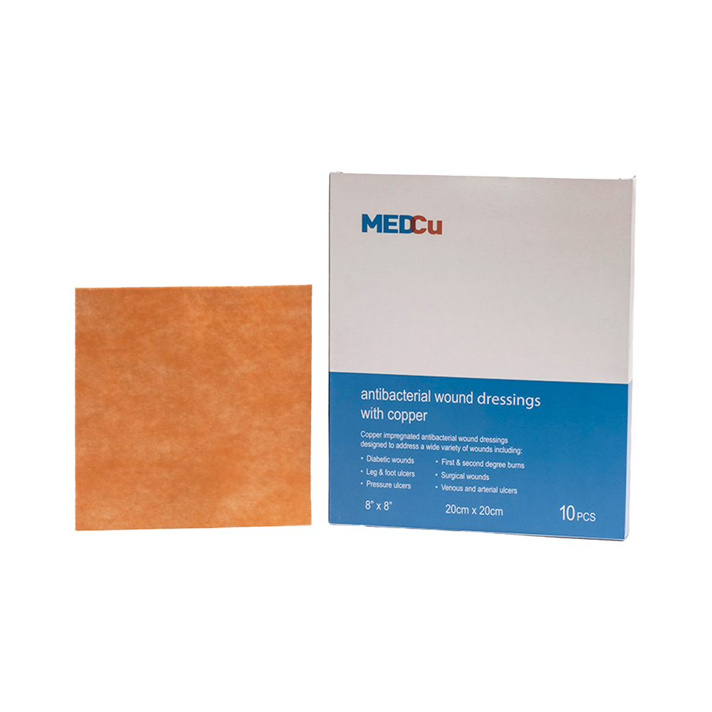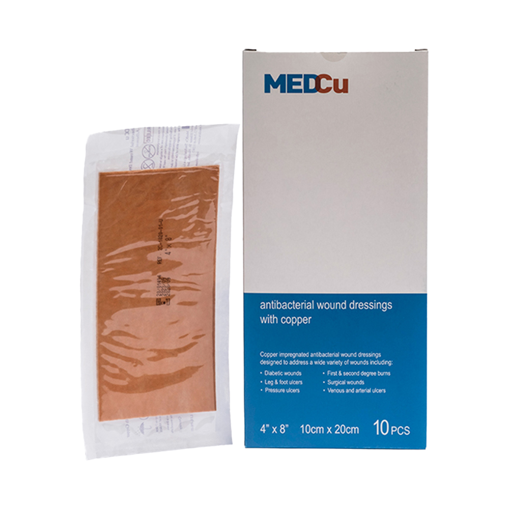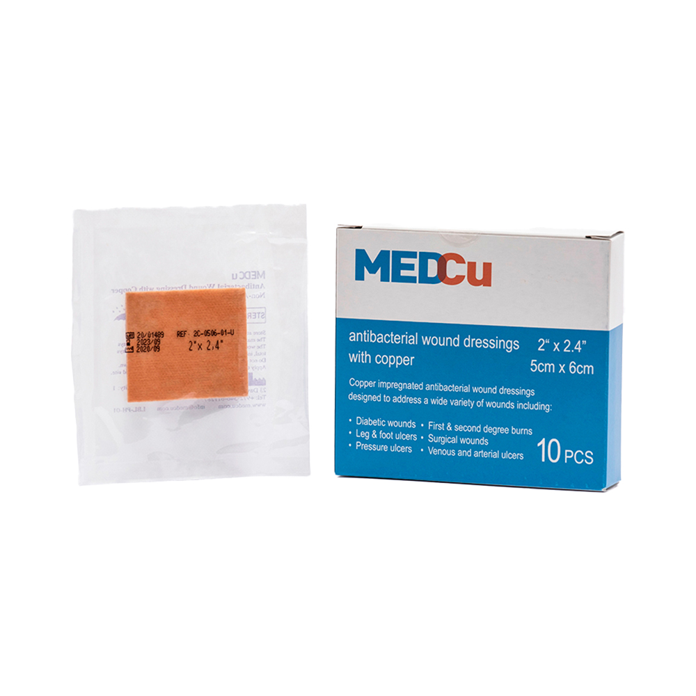 MedCu dressings are single-use wound dressing with an internal absorbent layer and one or two external non-woven, non-adherent layers. All layers are impregnated with copper oxide particles. The dressings are non-irritant, non-sensitizing, and are available in 7 configurations, with or without an adhesive contour.