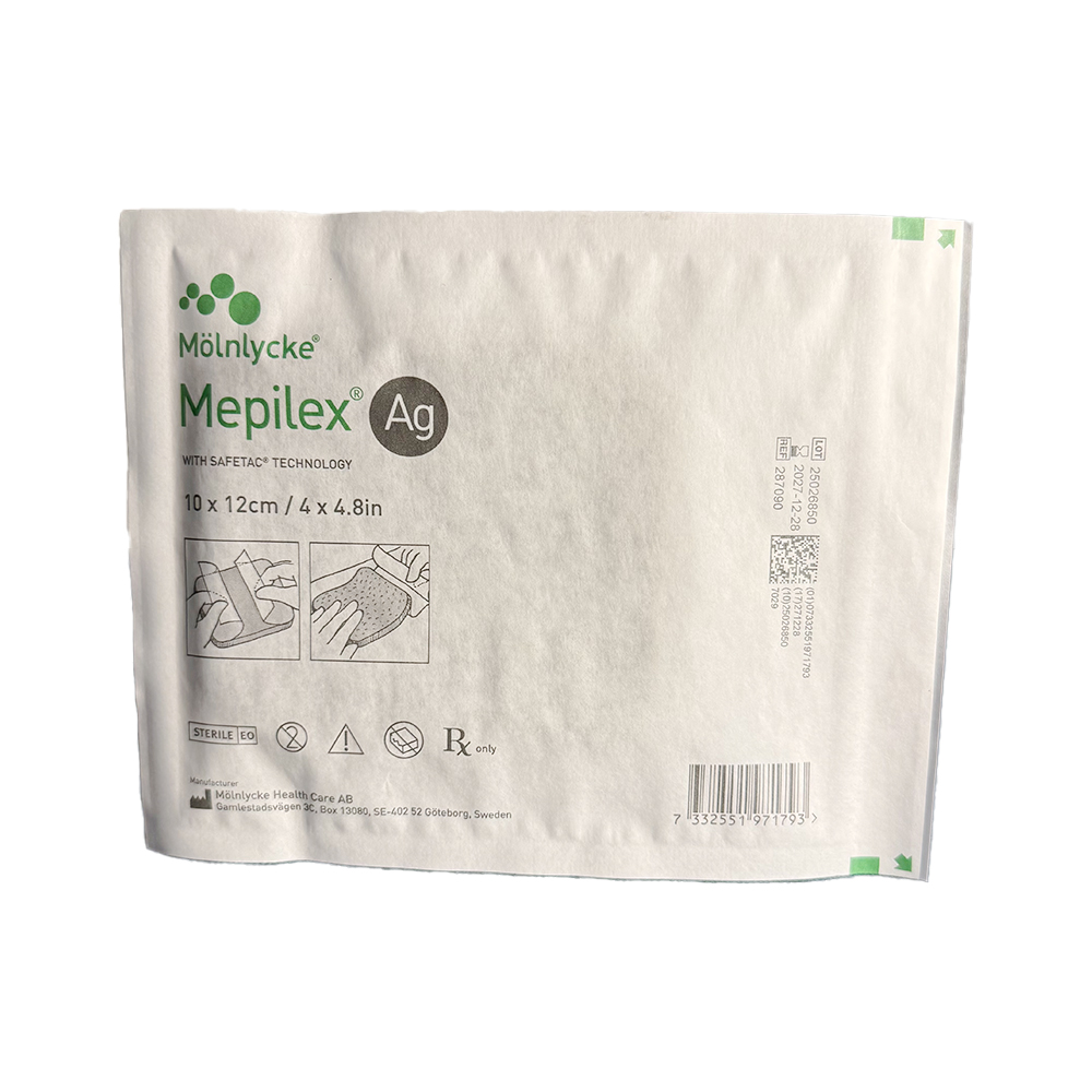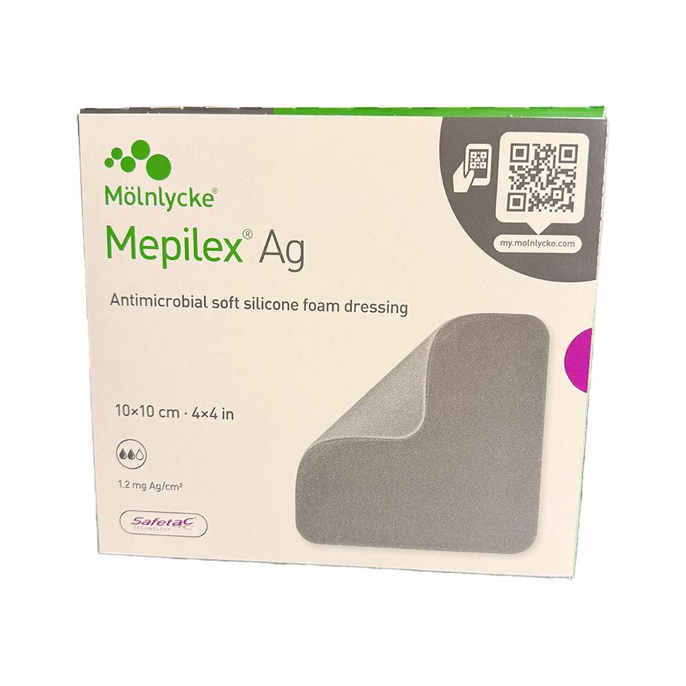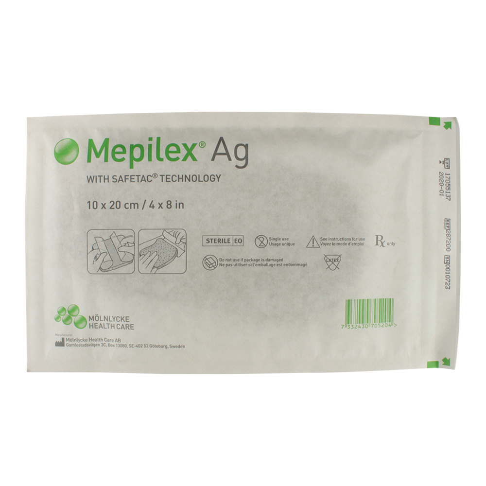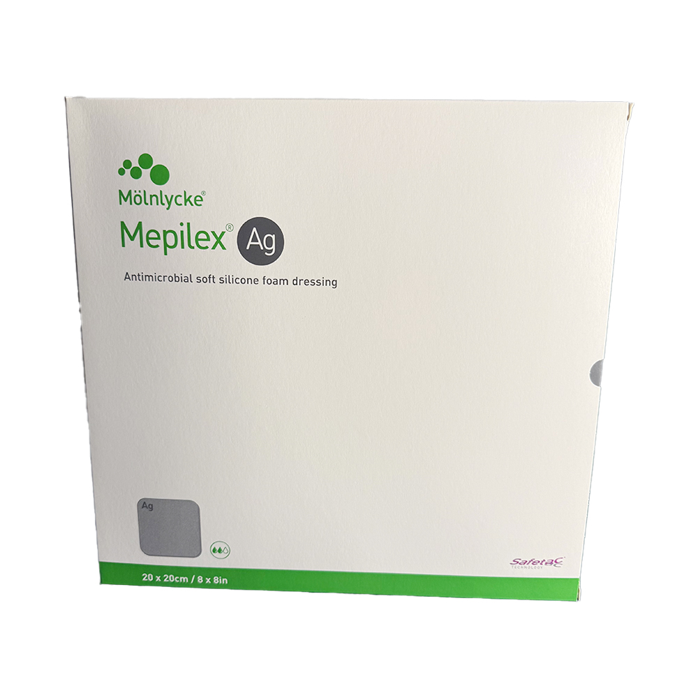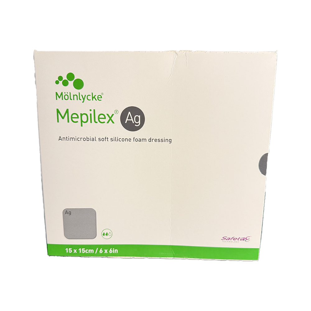 Mepilex Ag is an soft, gray, antimicrobial foam dressing that feels comfortable against the skin while utilizing silver and Safetac technology to close the wound’s edges, preventing exudate from leaking onto the surrounding skin, minimizing the risk of maceration. Once applied, Mepilex Ag begins to deactivate pathogens on the wound bed within 30 seconds and continues to do so for up to seven days after application, helping to reducing odor and infection. The adhesive does not stick to the injured skin, but does stick to the surrounding skin.
