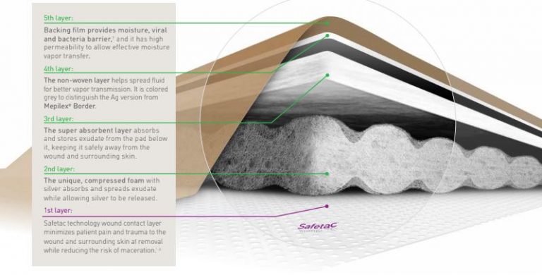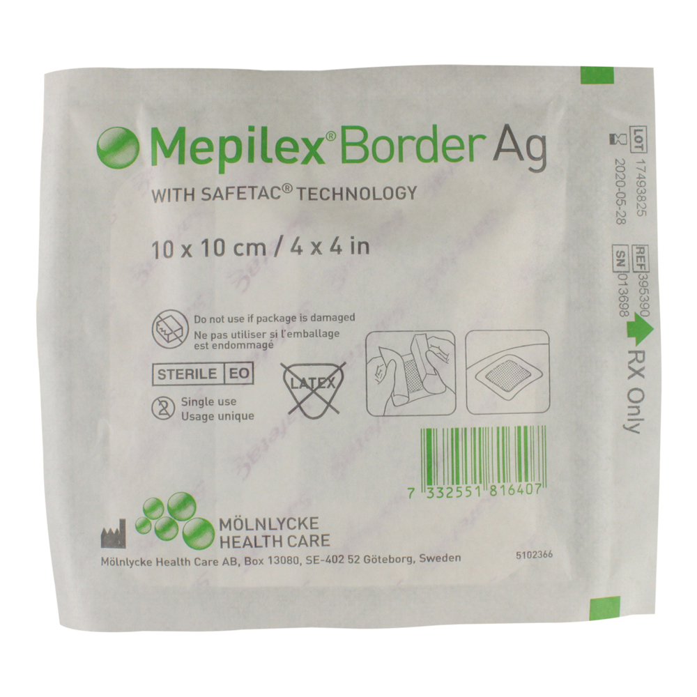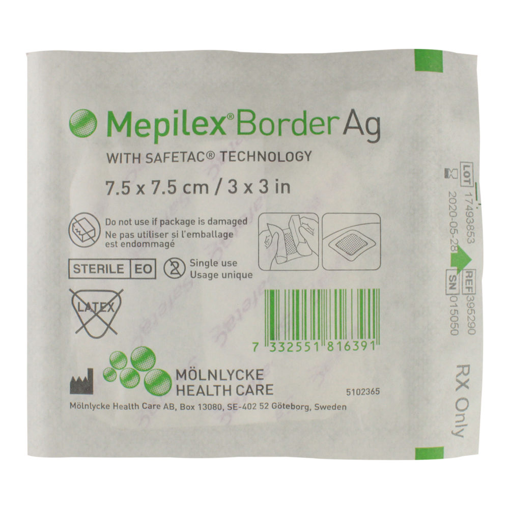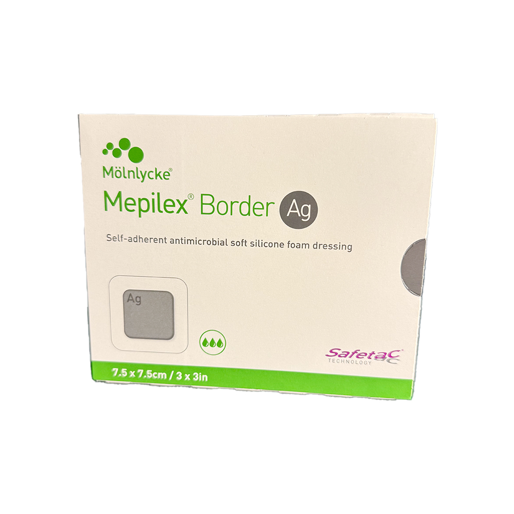 Mepilex Border Ag Foam Dressings provide an all-in-one solution for absorbing and holding onto exudate and creating a moist environment for optimal wound healing. Releasing silver sulphate particles, this antimicrobial foam dressing utilizes Safetac technology to close off the wound’s edges. This action prevents exudate from leaking from the dressing onto the surrounding skin, lowers the risk of irritation and maceration, and reduces damage to the wound and surrounding skin during removal.