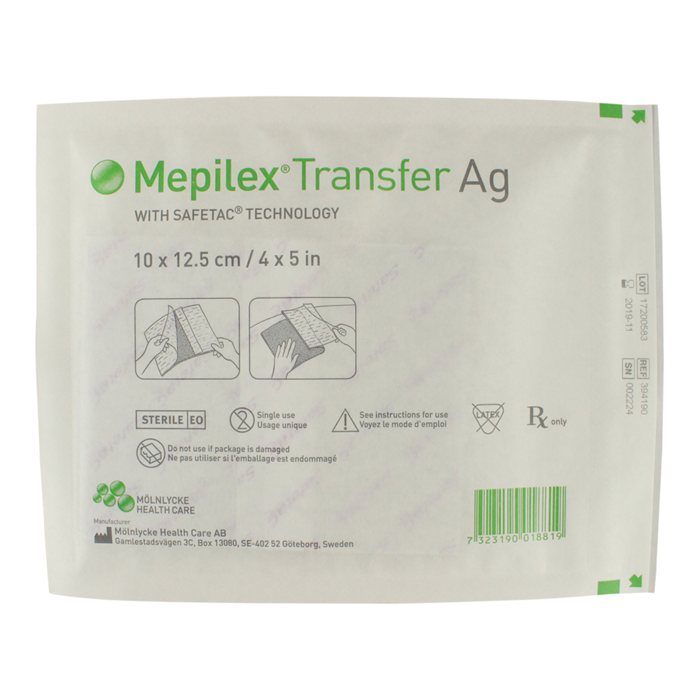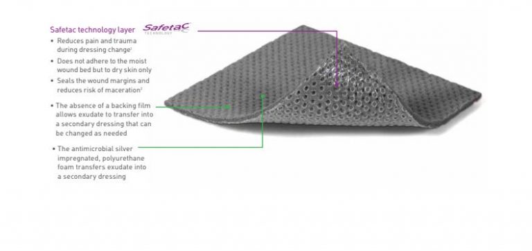 Mepilex Transfer Ag with Safetac is a “multi-benefit” transfer dressing designed for low to high exuding wounds and with the patient as a central mind. Safetac is clinically proven to minimize stress and pain for the patient while having direct contact to the wound and surrounding skin. Safetac seals around the wound, allowing the foam to effectively transfer exudate to a 2nd layer whilst preventing microbial growth. It all adds up to undisturbed healing.