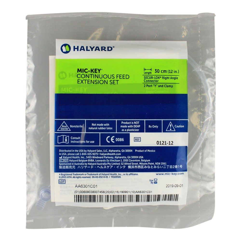 These non-sterile, reusable feeding tube extension sets are made with natural rubber latex-free materials and are compatible with any of the MIC-KEY* feeding tubes. Each extension set is 30 cm long and about 2 inches in size. Each set includes 2 connectors, one is a 2 port “Y” and the other is the SECUR-LOK* Right Angle. There are also medication ports, a tubing clamp and 5 units per case. Compatible with SECUR-LOK*.