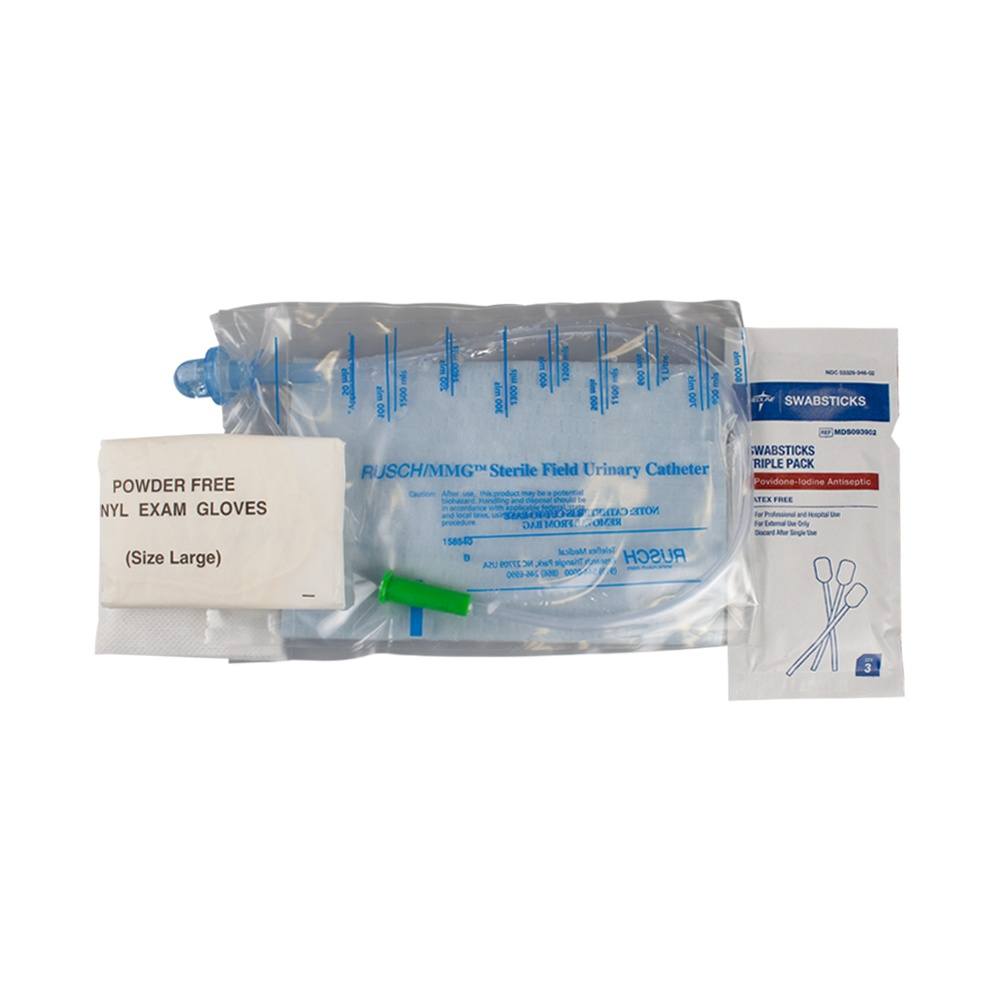 The Rusch MMG Coude Tip Intermittent Urinary Catheter Kit contains a gauze tissue, povidone iodine swabs, two gloves and underpad. Medical studies have proven that MMG users are nine times less likely to contract UTI’s than those using other conventional methods. Our soft silicone “introducer” tip shields the catheter through the tip of the urethral opening bypassing the majority of urinary tract bacteria. The self-contained intermittent catheter system is fully protected within its own closed sterile field. It is pre-lubricated, the catheter and soft silicone “Introducer” tip are both coated with non-allergenic, water-soluble lubricant for easy insertion. No separate lubrication procedure is needed. The MMG Systems’s vinyl catheter drainage eyelets are recessed and polished and the tips are tapered assuring smoother glide passage through the urethra. The self-contained urine collection bag eliminates the need for separate containers, thus reducing the risk of spillage and allowing for ease of disposal. The MMG System provides greater comfort and mobility away from home. It fits in your pocket or purse, no bulky trays to carry around. The MMG Systems’s unique patented “break-away” funnel end provides a safe and easy urine sampling procedure. It is sterile for single use.