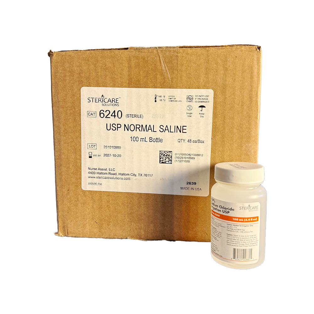 Nurse Assist USP Normal Sterile Saline For Irrigation is ideal for wound irrigation, feeding tube flush, foley catheter inflation and device irrigation. It is meant to remove cellular debris and surface pathogens contained in wound exudates or residue.
