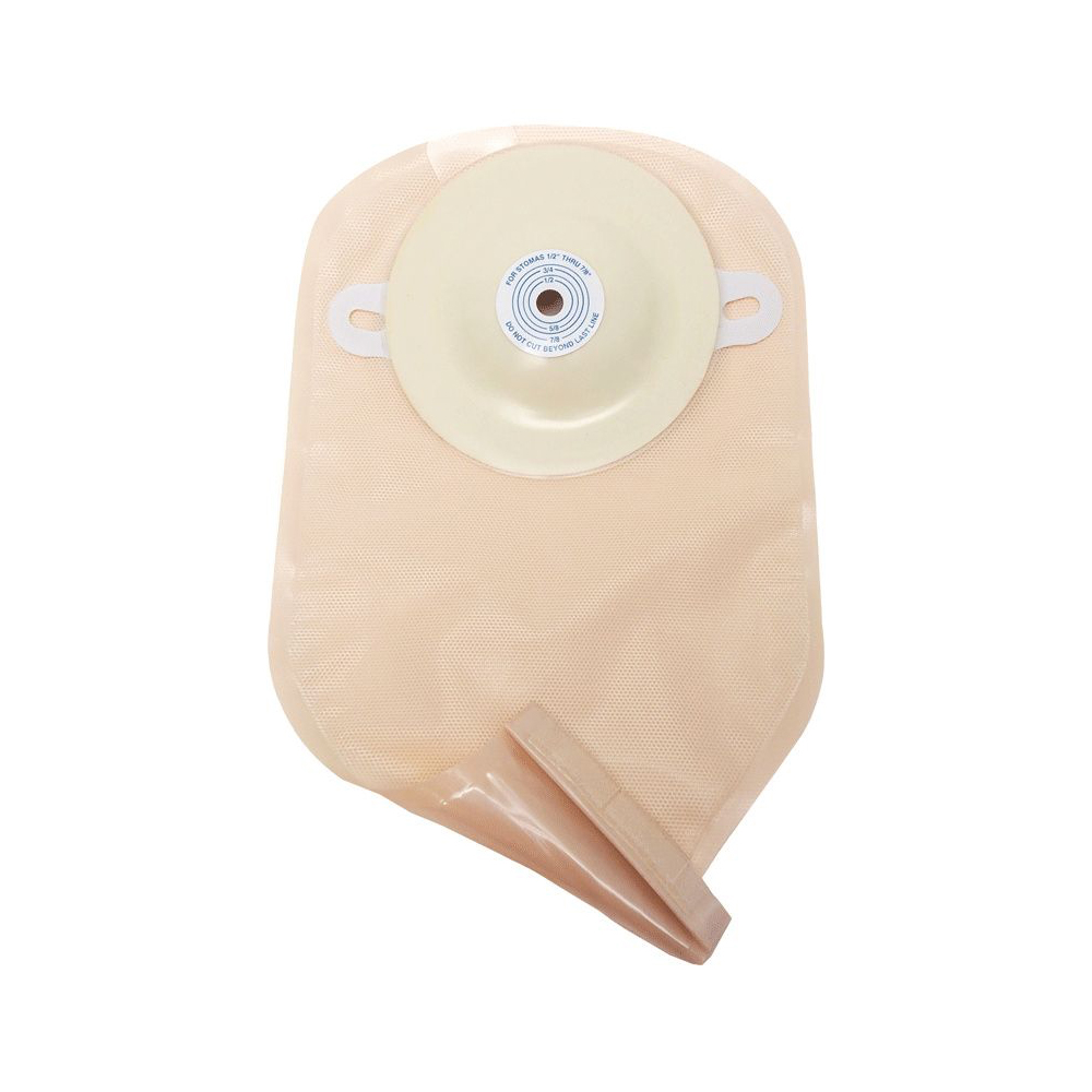 Nu-Hope Standard Round Flat Trim-to-Fit Barrier and Adult Clear Drainable Pouch. Adult 24 ounce capacity drainable pouch. 3(1/2)” pre-coated, waterproof adhesive foam pad. Odor-proof drainable pouch with belt tabs and one-sided comfort panel.