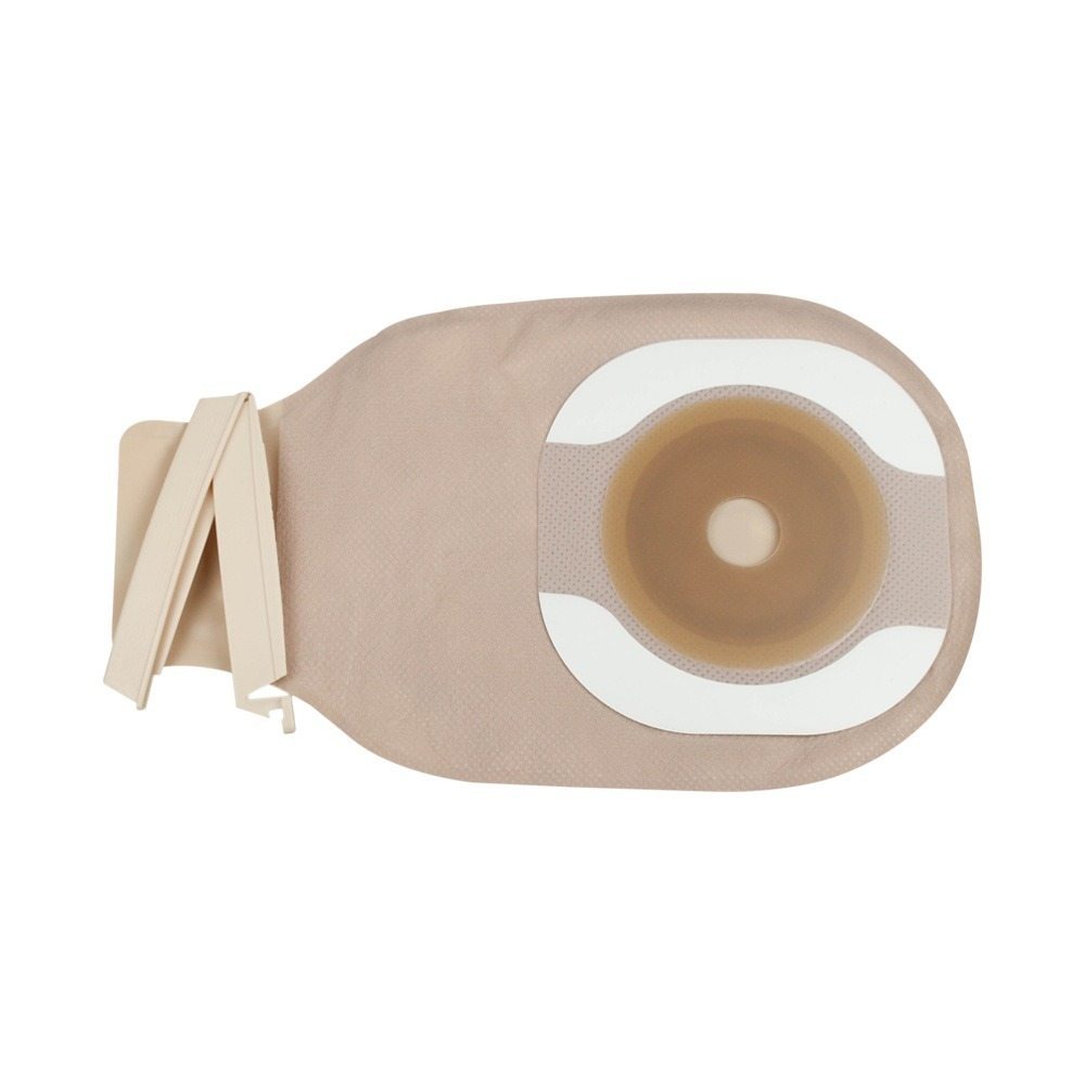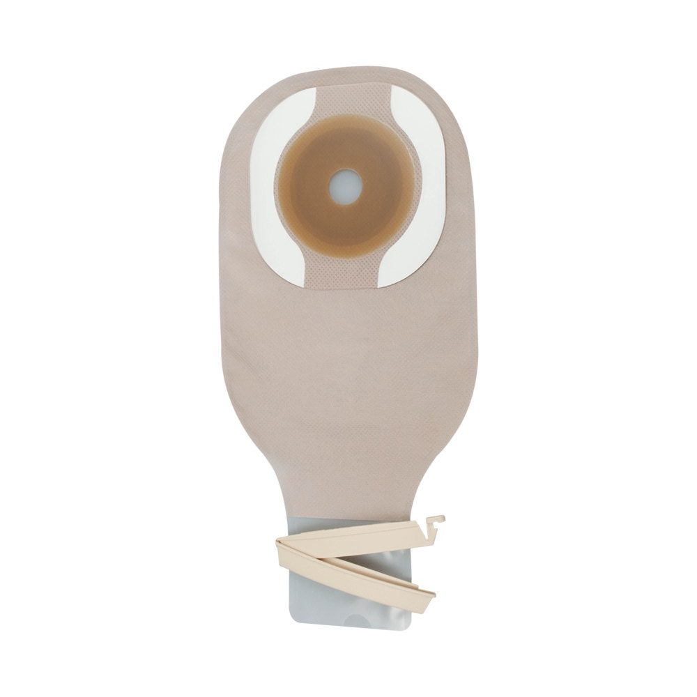 A one-piece, drainable pouching system designed to be opened at the bottom when emptying. These pouches are most suitable for colostomies or ileostomies. The Flextend barrier is an extended wear skin barrier that is durable and offers high resistance to erosion. To close the pouch, use the curved, beige clamp. Soft, beige ComfortWear pouch panels help provide comfort.