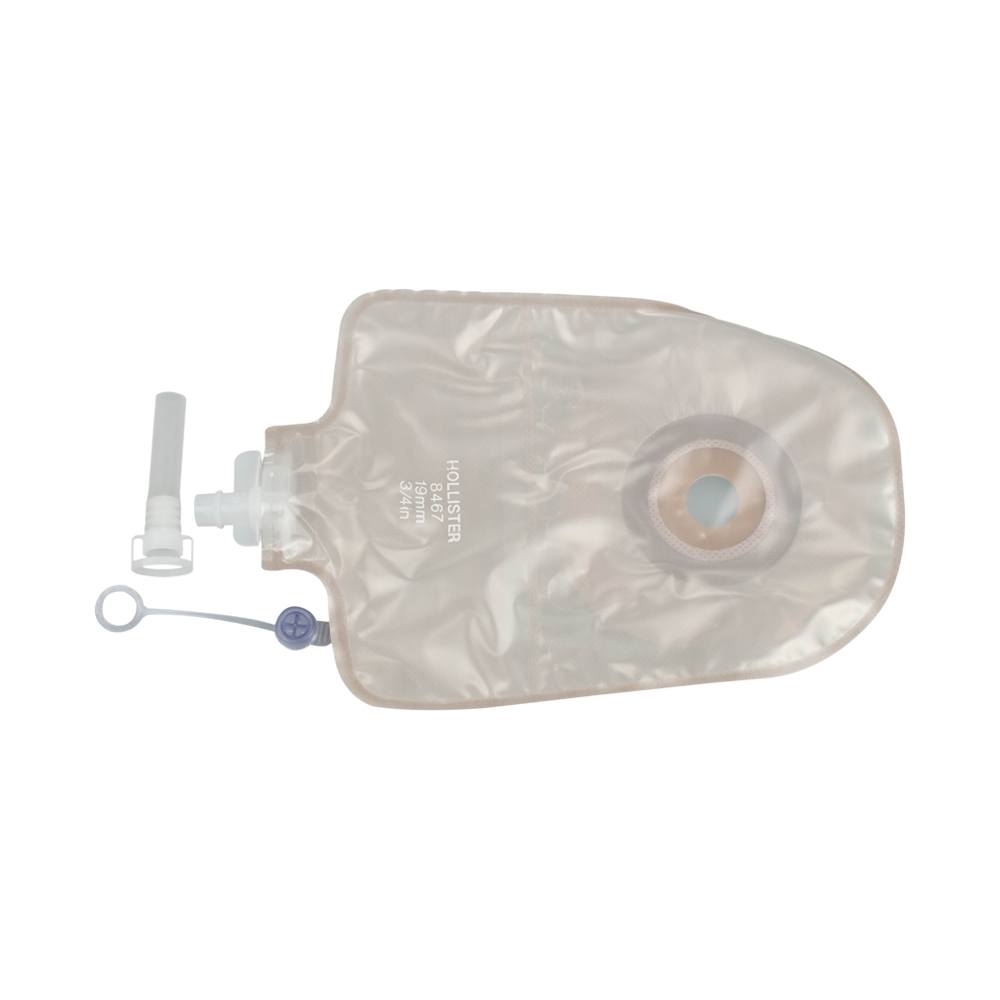 A one-piece, urostomy pouching system with a tap at the bottom, which allows it to be connected to a bedside collector with the use of the adapter provided. The Flextend barrier is an extended wear skin barrier that is durable and offers high resistance to erosion. Anti-reflux feature in pouch minimizes backflow of urine. Soft, beige ComfortWear pouch panels help provide comfort.