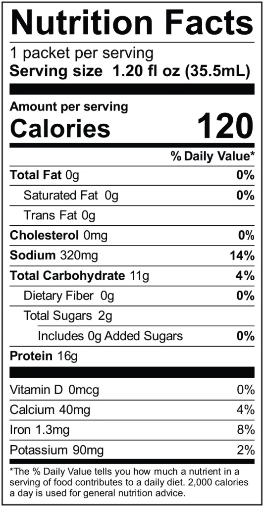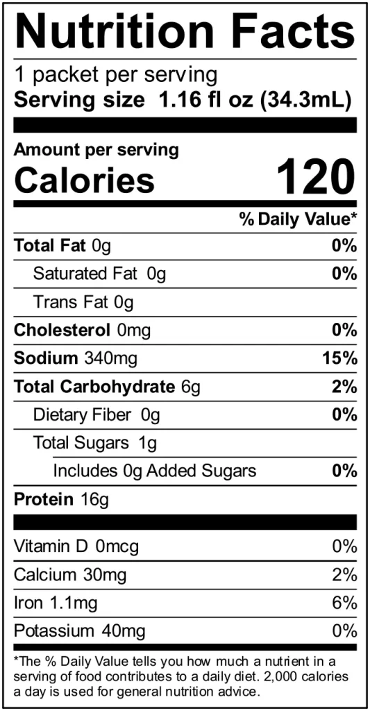 Hydrolyzed Kosher Collagen, Water, Glycerin, Tomato Powder, Maltodextrin, L-Arginine, Citric Acid, Malic Acid, Salt, Vinegar Solids, Natural Flavors, L-Tryptophan, Medium Chain Triglycerides, Potassium Sorbate & Sodium Benzoate (to maintain freshness), Sucralose, Onion Powder, Neotame, Red Pepper.