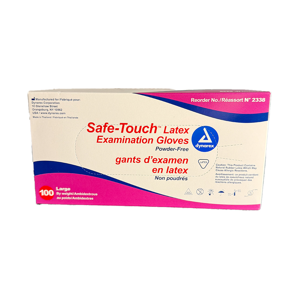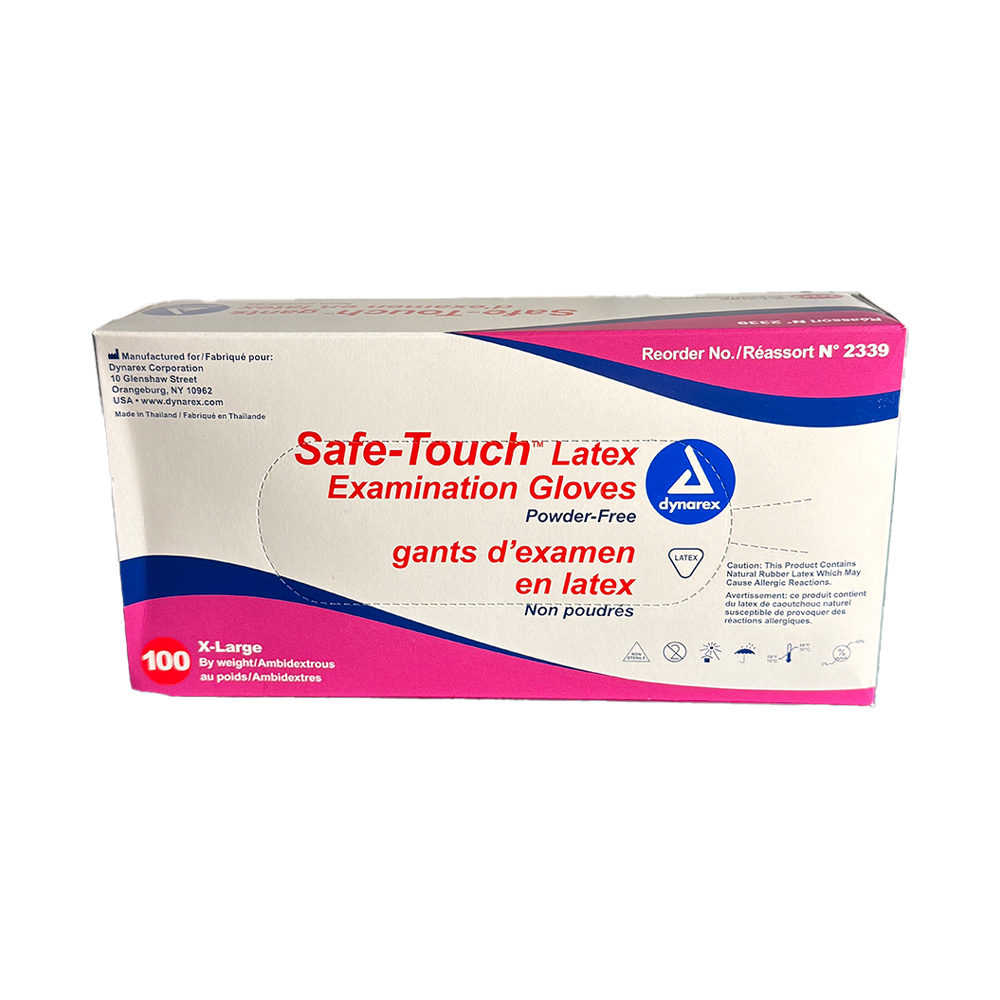 Dynarex Safe-Touch® Latex Exam Gloves are crafted from a specially formulated latex material for optimal performance and durability. The ambidextrous gloves are designed with textured fingertips for secure grip and 3 mil. minimum thickness for increased tactile sensitivity and puncture resistance. A polymer lining and beaded cuff ensure easy donning and prevent tears. The gloves fit securely around the wrist and have hand-conforming flexibility to prevent physical fatigue. Frequently used in many settings including veterinary clinics, retirement homes, and medical facilities.