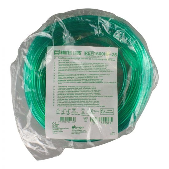 For oxygen flows up to 15 LPM where patients prefer comfort and convenience instead of a mask (includes bright green supply tubing). Salter-Style high flow cannulas with 3-channel safety supply tubing for high flow volumes up to 15 LPM