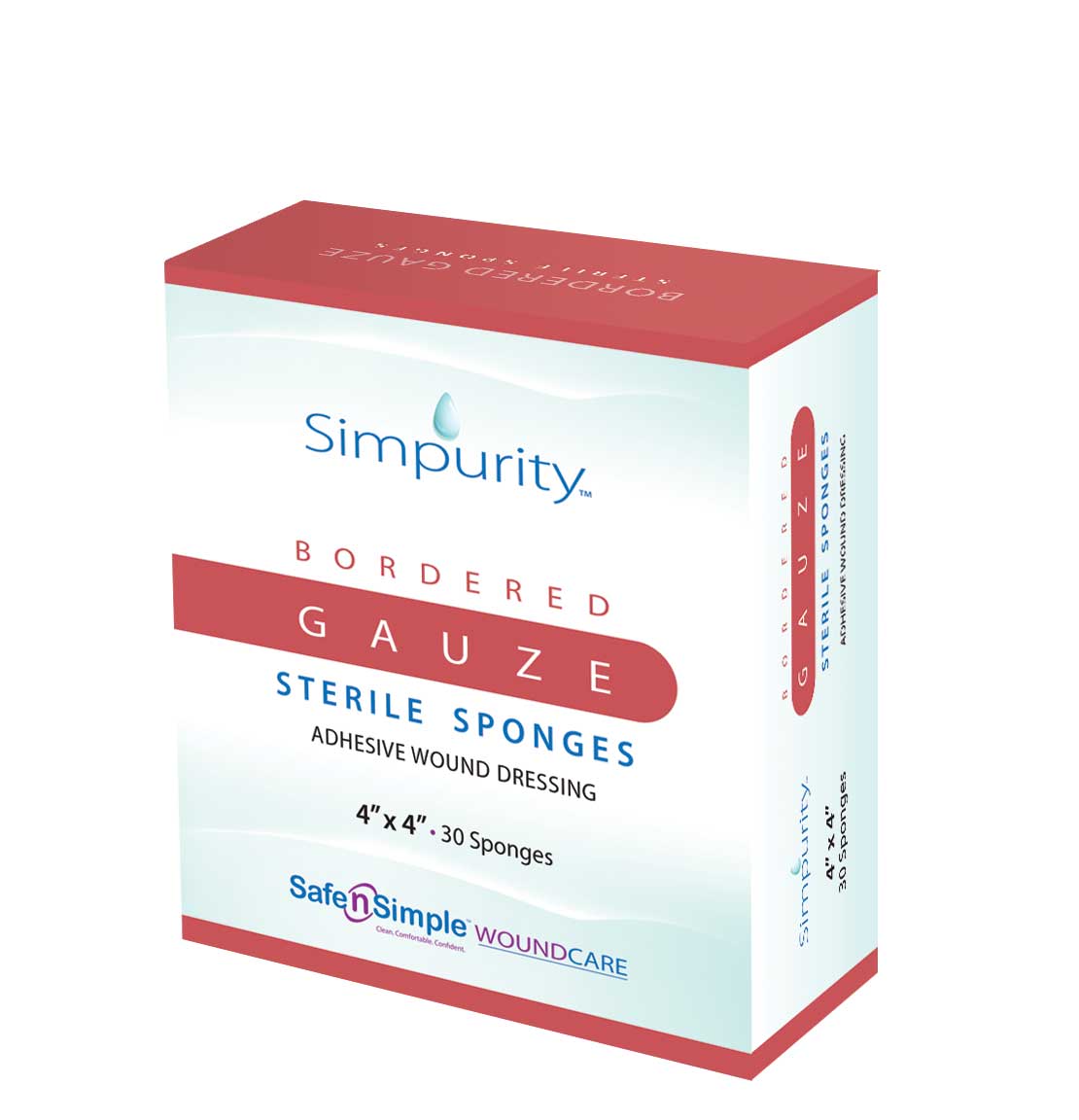 Simpurity Bordered Gauze Sterile Sponges are a non-adherent gauze sponge island dressing with an adhesive border. These woven sponges are made of 12-ply 100% USP cotton for use as a secondary dressing. The sponge absorbs exudate for a cleaner wound bed and the adhesive border protects the wound from outside contaminants.