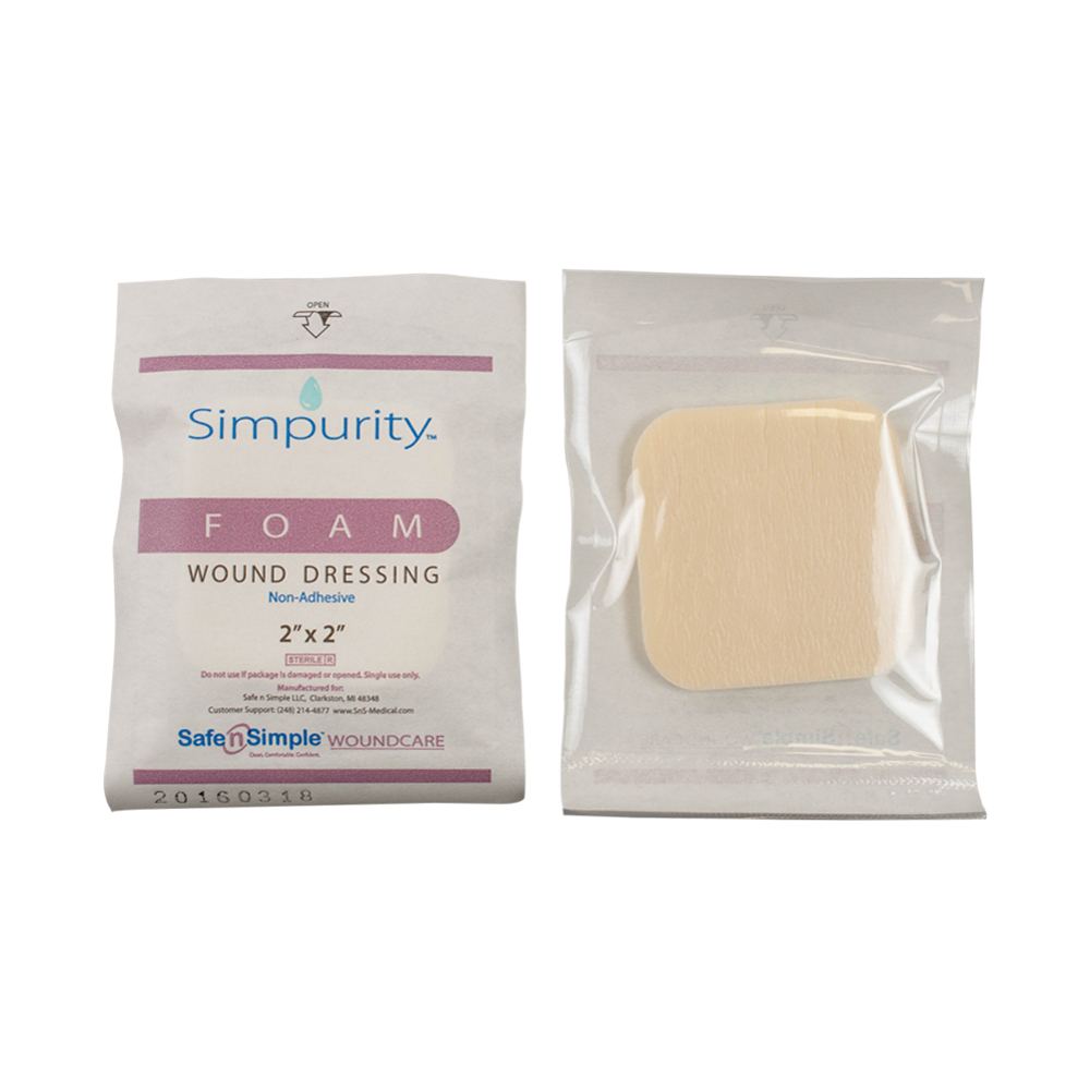 Simpurity Foam wound dressings are designed to help manage moderate-to-highly draining wounds. The dressing absorbs wound exudate, promotes moist wound healing, protects the wound from contaminants and permits moisture vapor exchange.The white side of the foam dressing is applied to the wound. The coral colored top of the foam dressing contains a moisture permeable layer designed to protect against exudate strike-through while acting as a protective barrier to outside wound contaminants. Simpurity Foam dressings are designed to be easily removed from the wound sites. The non-adhesive construction of the dressing helps to assure that the skin around the wound perimeter is not damaged.