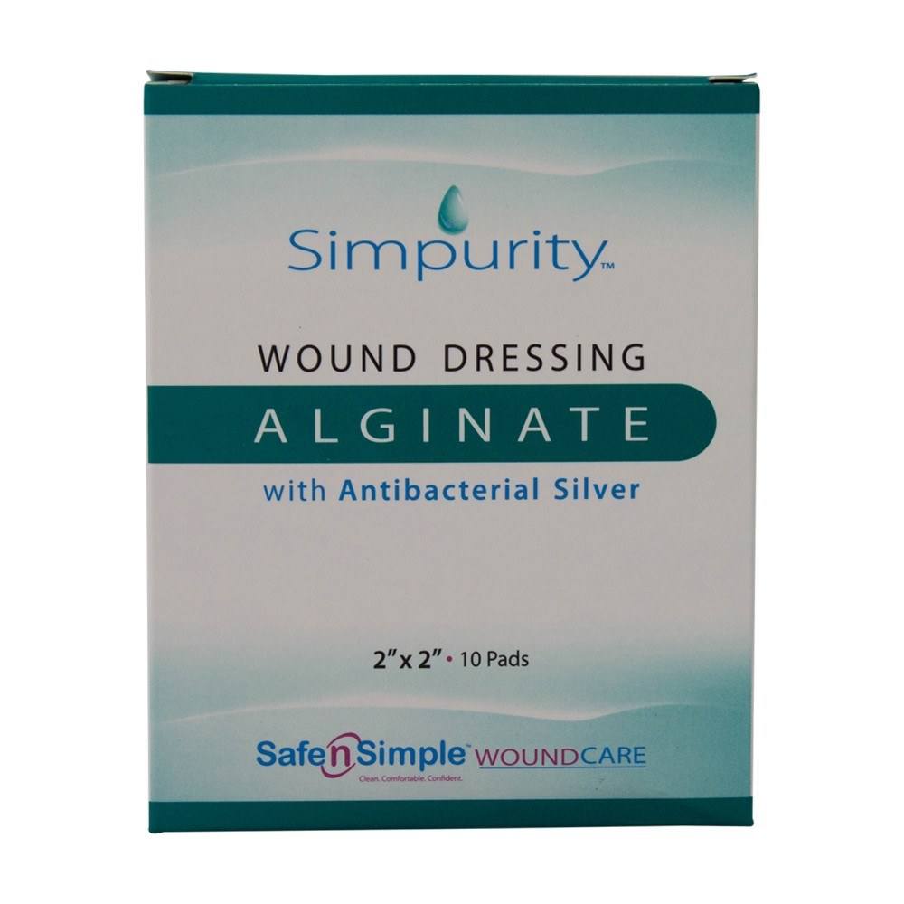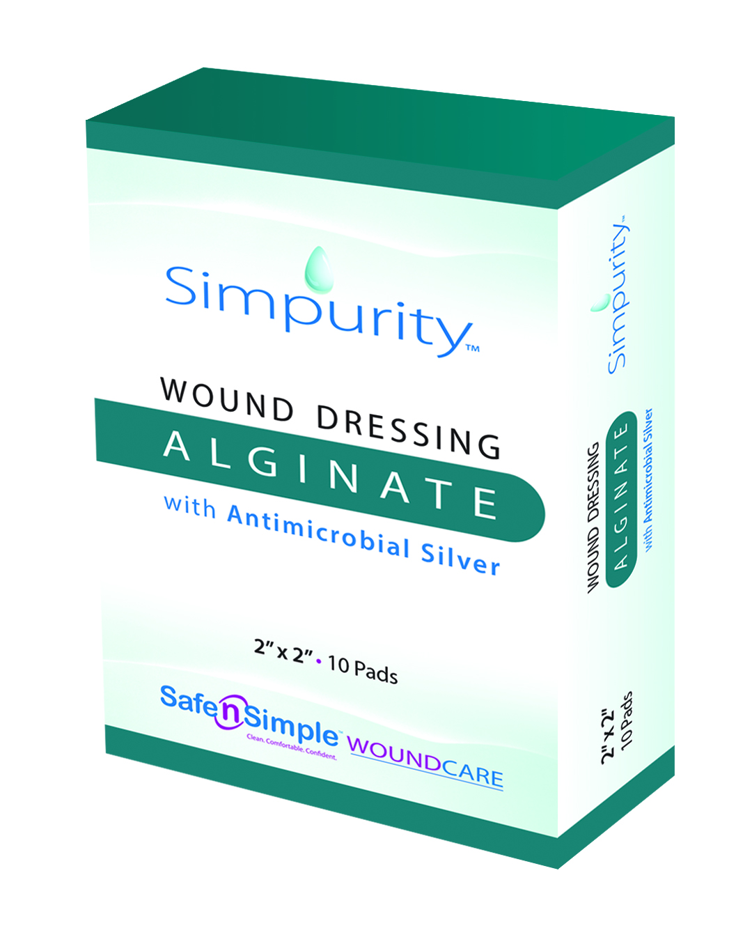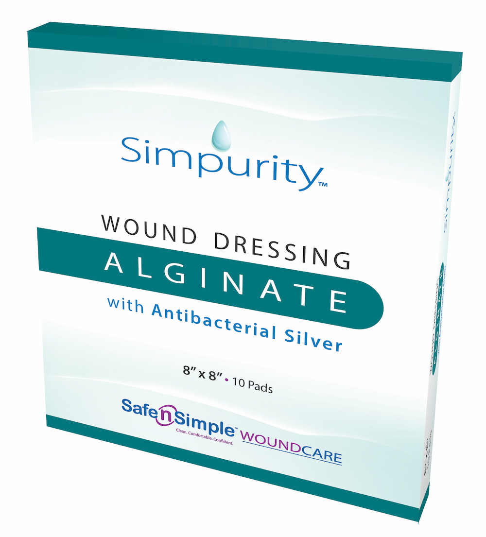 The Simpurity Silver Alginate dressing has been tested in vitro and found to be effective against bacteria such as: Staphylococcus aureus, Enterococcus faecalis, Streptococcus pyogenes, Escherichia coli, Pseudomonas aeruginosa, Klebsiella pneumoniae. Simpurity Silver Alginate dressings are available in 2” x 2”, 4” x 5” and 8” x 8” pad sizes, and 1”x 12” Rope.