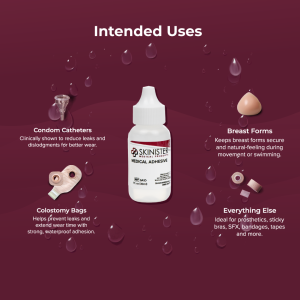 Use Skinister Medical Adhesive to safely attach and seal medical devices to skin, including ostomy bags, wafers, barriers and other ostomy supplies. It’s also an excellent breast form adhesive and wig glue. Clinically proven to minimize leaks and slippage of condom catheters.