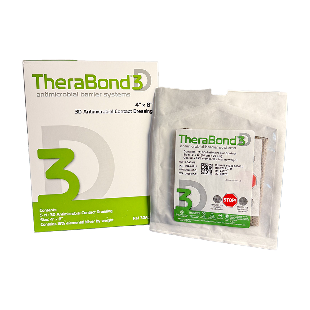 TheraBond 3D Antimicrobial Systems are absorbent, post-operative dressings consisting of silver plated nylon 3-D fabric. TherAbond 3D provides an effective barrier to bacterial penetration for up to 7 days. In the presence of exudate the dressing will help maintain a moist wound environment.