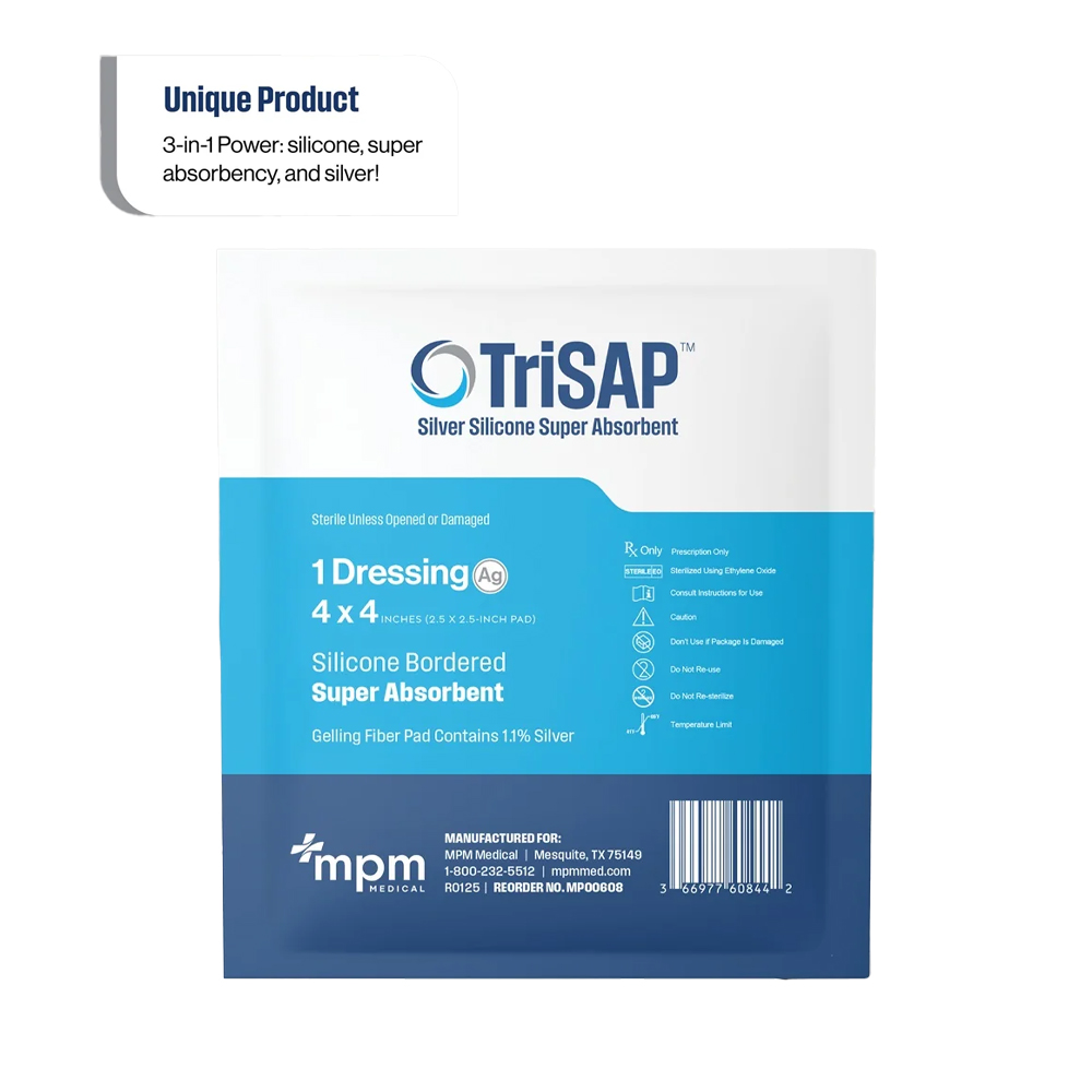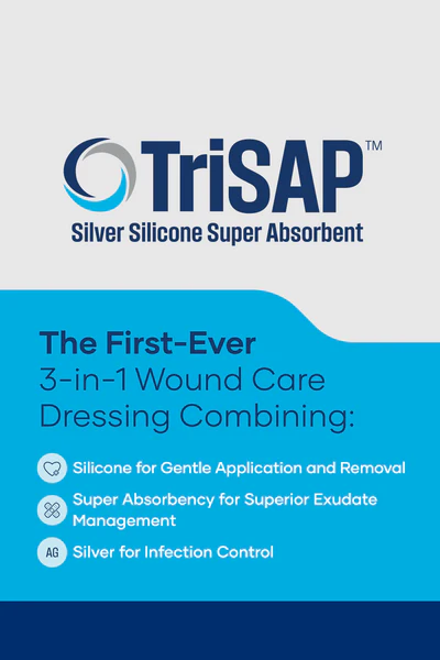 TriSAP™ Silver Silicone Super Absorbent Dressing manages exudate and infection risks while protecting the peri-wound. Its silicone border ensures gentle removal, even under compression, while the super absorbent core locks in bacteria to support healing. Infused with silver, it’s ideal for moderate to heavily exuding wounds at risk of infection.