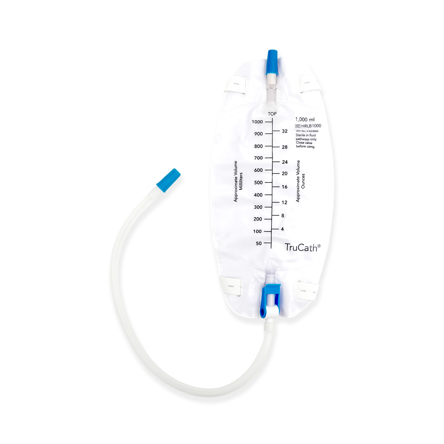 The TruCath® Leg Bags feature premium flocked backing and are available in 500 ml and 1,000 ml collection capacities. Each features a flip-drainage valve, sterile fluid pathway, and pre-attached elastic leg straps. The product is individually packaged.