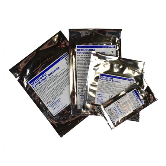 Xeroform is an impregnated gauze type of dressing with added 3% bismuth tribromophenate. In general, petrolatum impregnated dressings are designed to provide non-adherent packing for full-thickness wounds, creating an environment that facilitates the healing process. Xeroform dressings are made of fine, soft conformable gauze enhanced with white petrolatum.