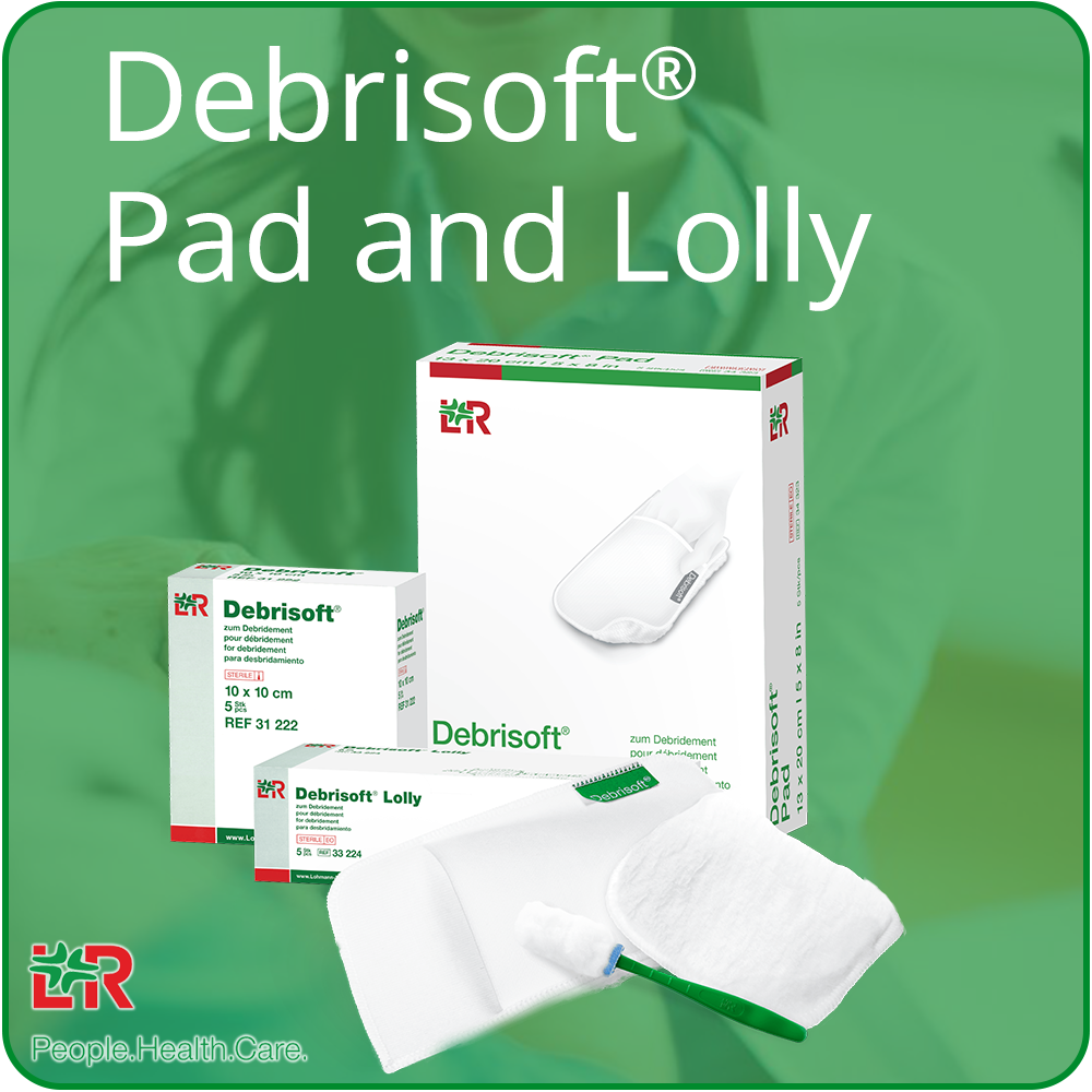 Debrisoft® Pads are ideal for cleansing wound surfaces and removing hyperkeratotic or dry skin, while Debrisoft® Lolly safely reaches deep, undermined, or tunneling areas where alternative debridement methods may be impractical.